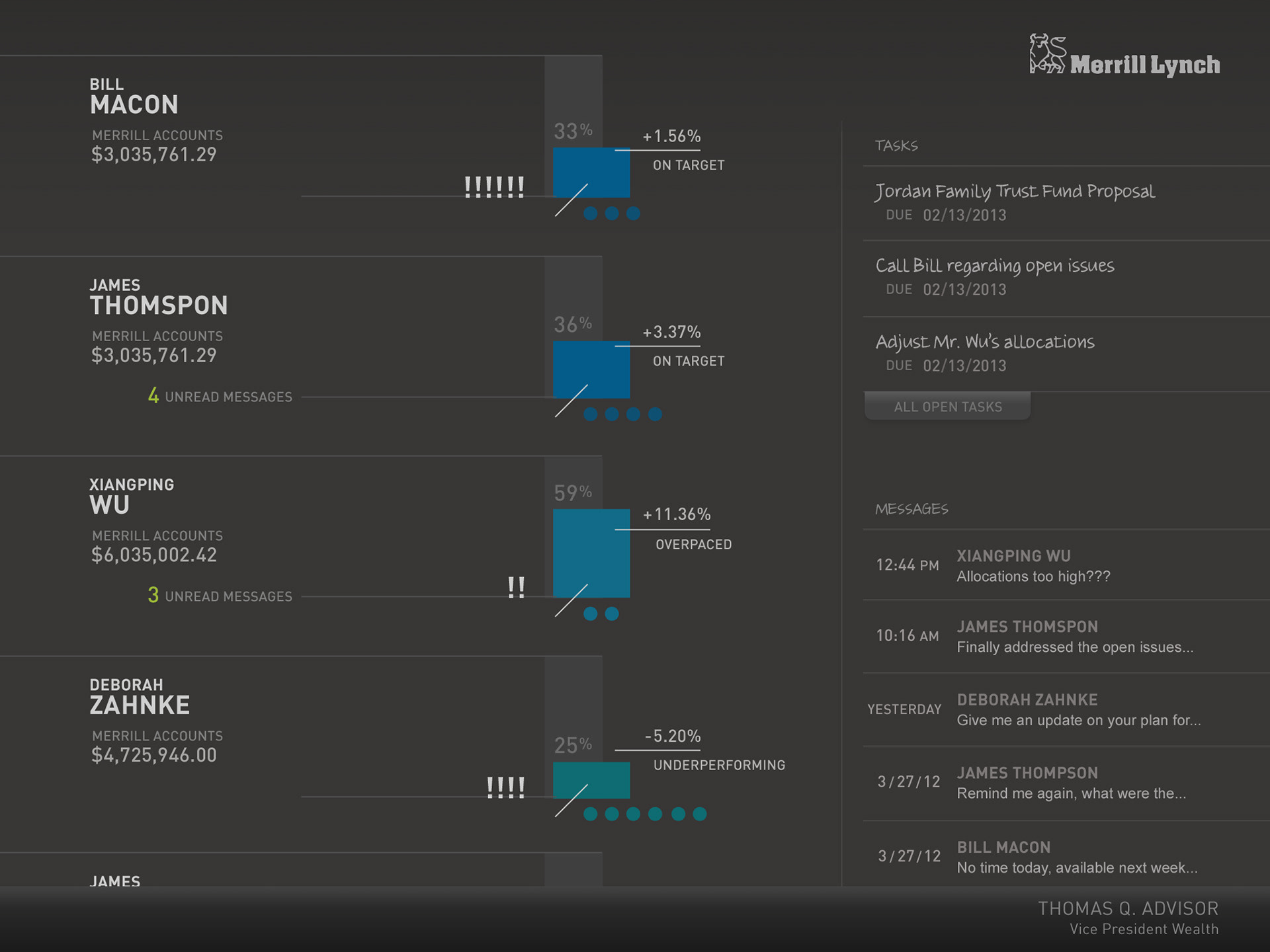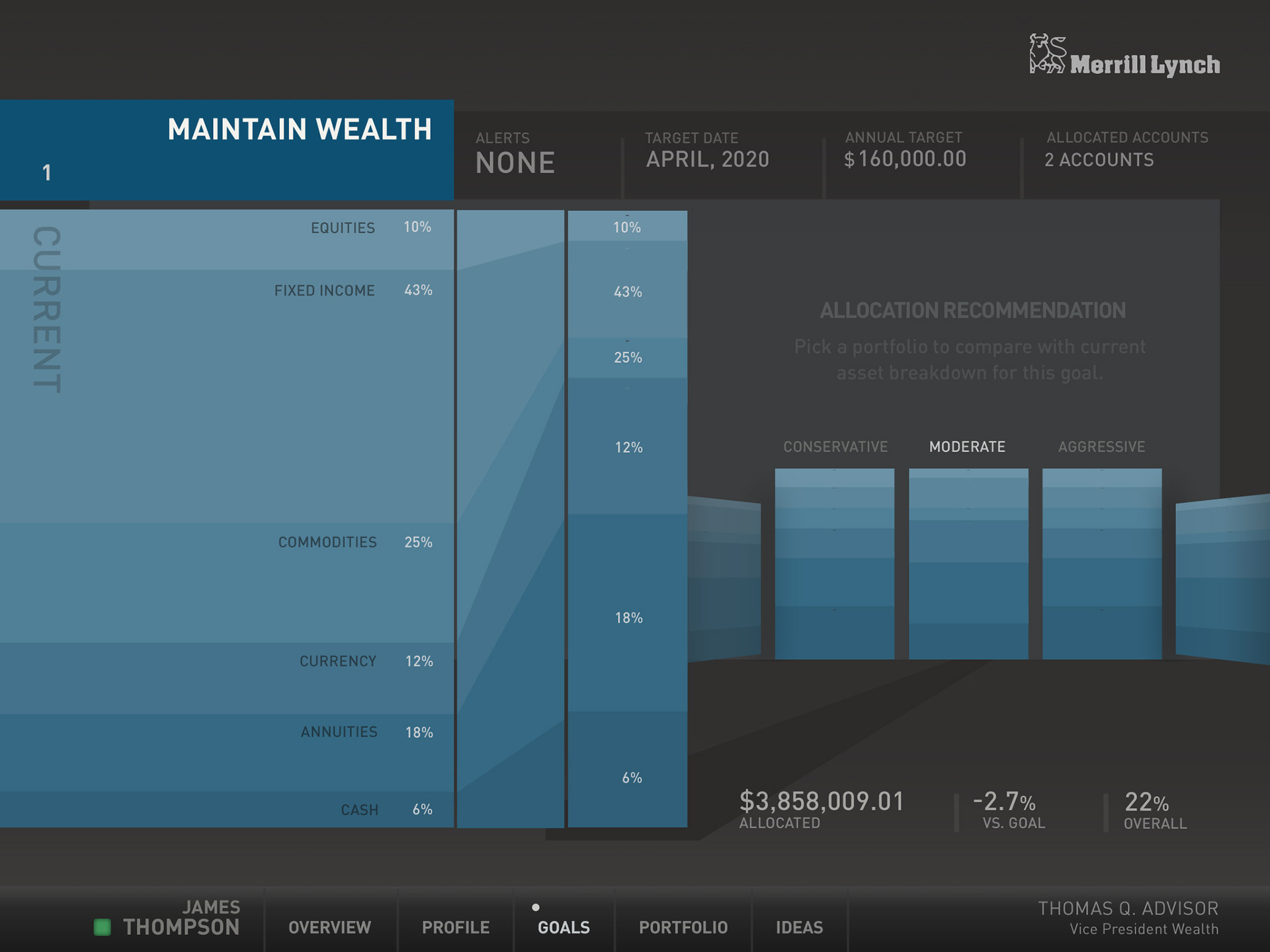 After the iPad launched, Merrill Lynch asked us to look into how it could be used to enhance advisor/client relationships. We knew Wealth Management clients expected a higher-degree of access than traditional retail banking, so we created a tool that lets them work off of the same page. Here's the flow: A client updates one of her goals, she alerts her advisor, the advisor sees the change. The adviser swipes up to reveal the advisor's UI which is the engine under the hood of the client's UI. The advisor can rework scenarios, allowing her client to see how goals will be affected, and then make some decisions. That's it. Not too far from real-life – just much faster and easier to get what you need.